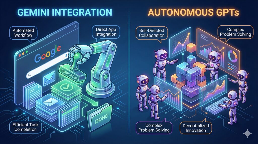 GeminiとChatGPT、どちらを選ぶかの最大の分かれ目は、「既存のツールを便利にしたいか」それとも「自分専用の新しいツールを作りたいか」にあります。それぞれの「必殺技」を具体的なユースケースで比較します。