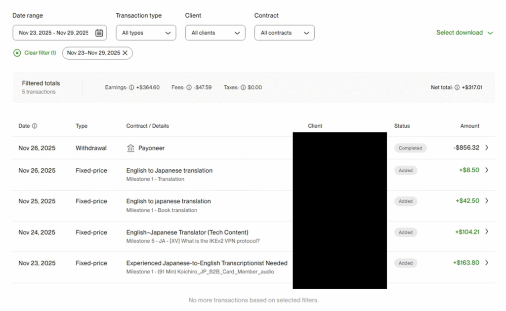 【2025年11月5週】Upworkやってみた +$319.01 成績と振り返り