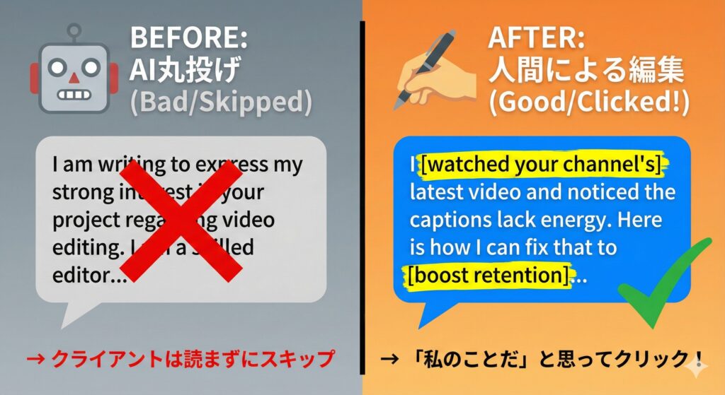 - 具体性がない: “I can complete your project efficiently and with high quality.” といった、誰にでも言える抽象的な言葉が並んでいる。