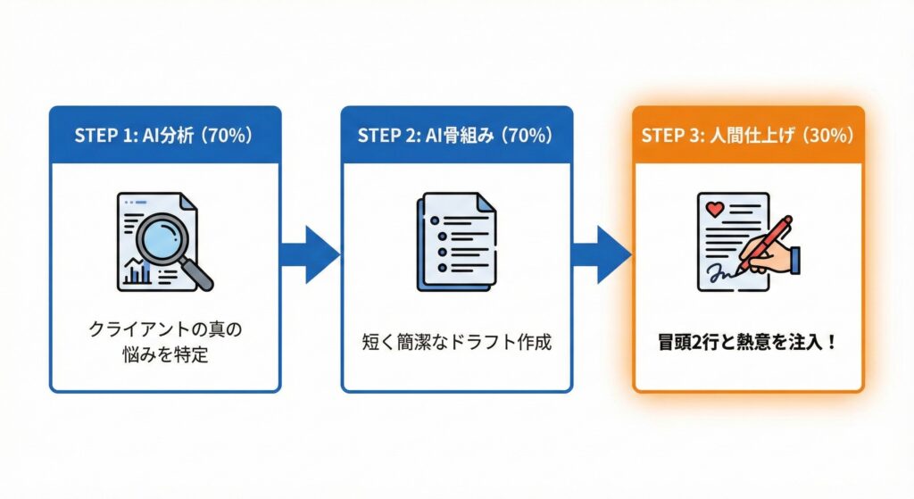 では、どうすればAIの効率性を活かしつつ、クライアントに響く提案文が書けるのでしょうか。その答えが「7:3の法則」です。