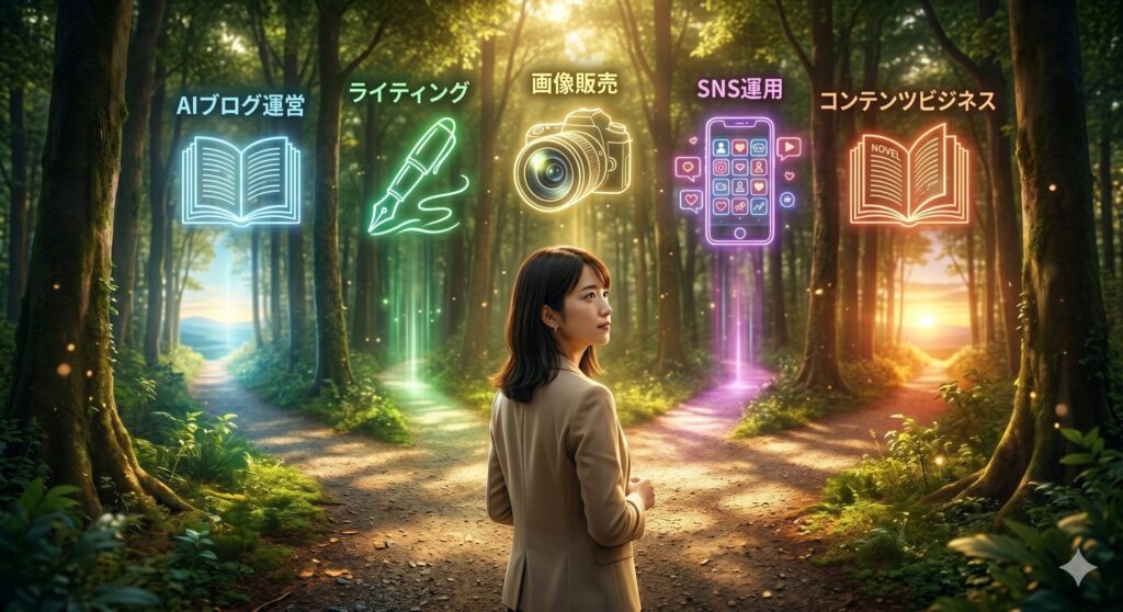 - 「ブログ運営」「ライティング案件」「画像販売」「SNS代行」「コンテンツ販売」など、多様な選択肢がある。