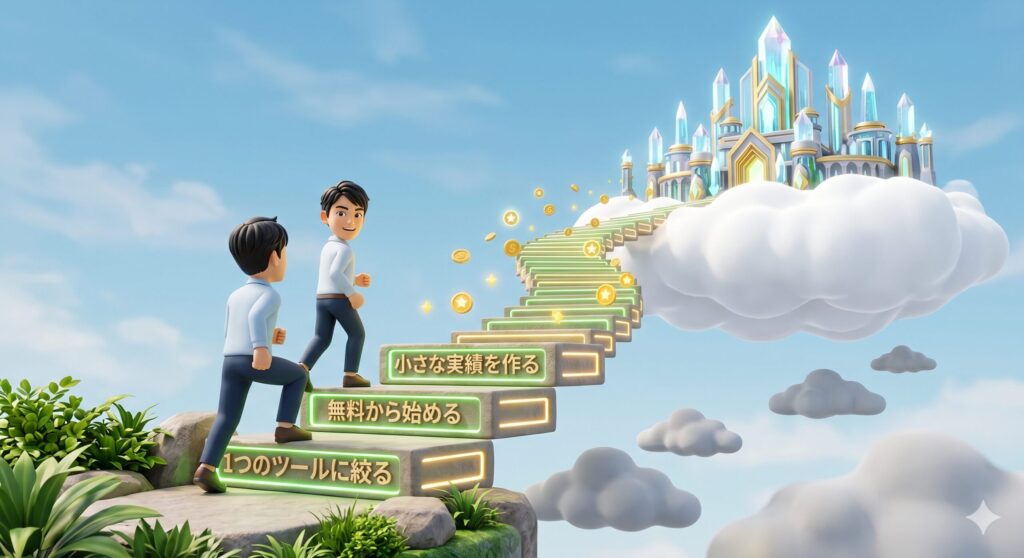 まずは1つのツールを開き、1つの分野を決め、小さな第一歩を踏み出してほしい。あなたのAI副業の成功は、その小さな行動の積み重ねの先にあるのだ。