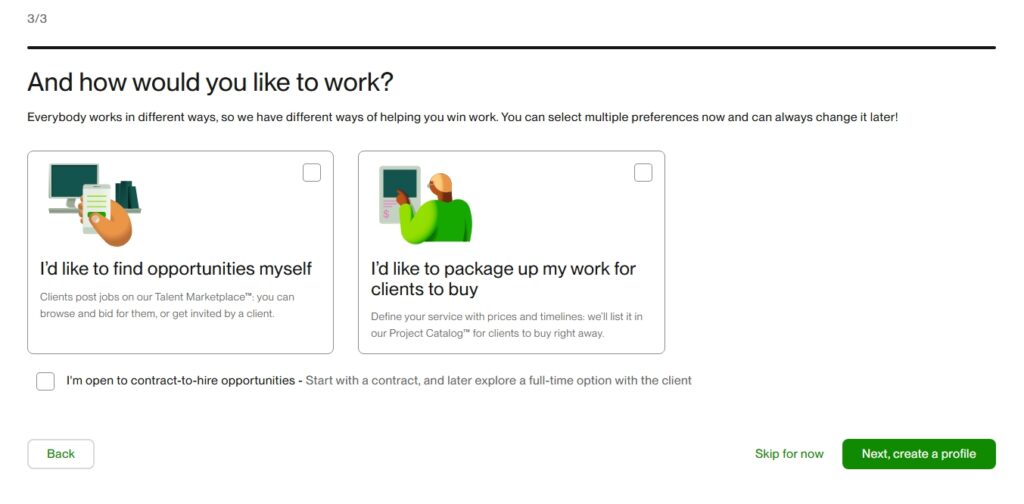 ここでは右の “I’m a freelancer, looking for work” の右上の○ボタンをクリックして、 “Create Account” をクリックします。
