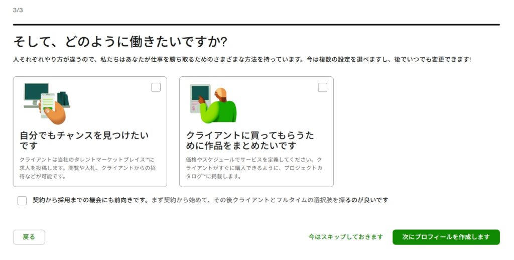 次は、どのように案件を拾うかの選択肢です。最初はいきなり作品を買ってもらうことは難しいので、少なくとも左のチェックボックスにはチェックを入れておきましょう。