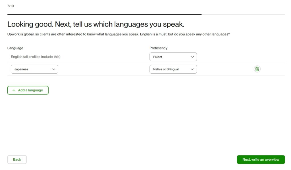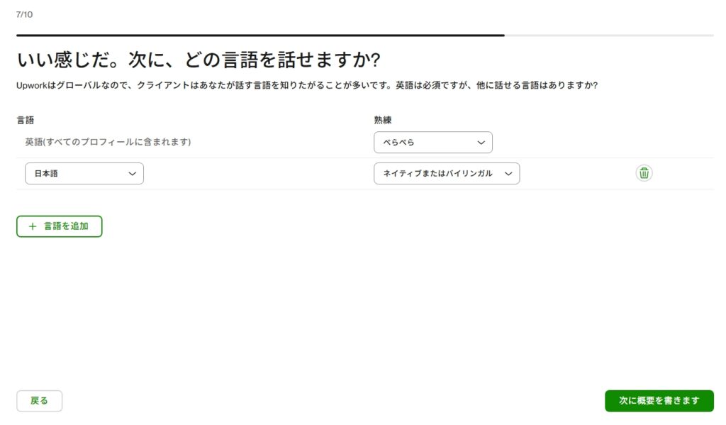 次に言語の選択。Japaneseは必ず選択するようにしてください。英語は自信がなくても “Fluent” 以上にしてください。あなたは翻訳家なのですから!