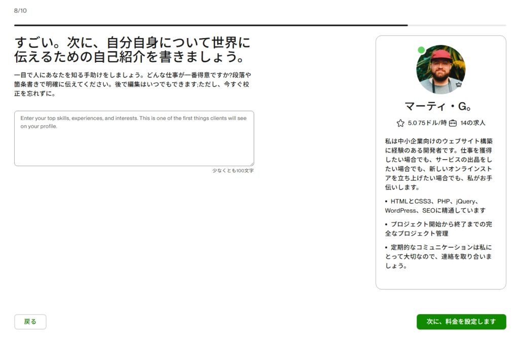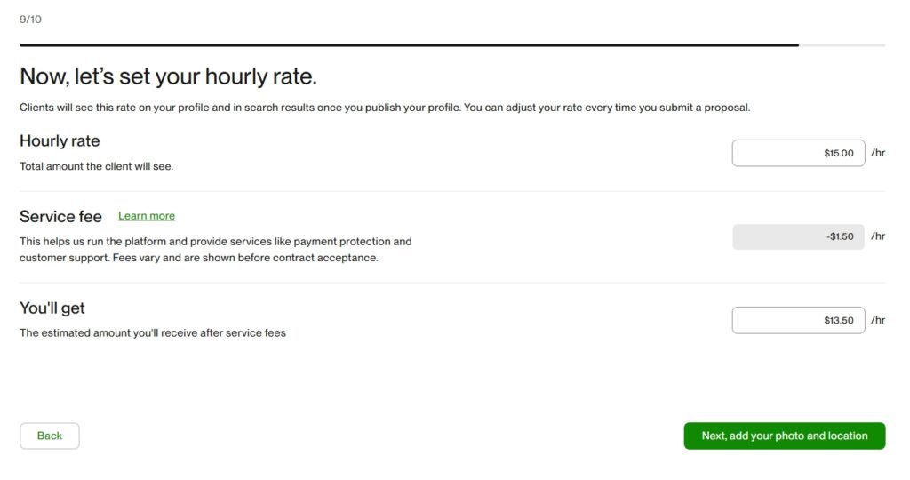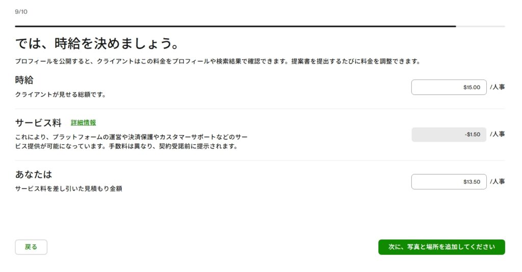 次に時給です。ここは重要そうに見えますが、後から変更できますのでまずは15~20ドル/時間にしておきましょう。
