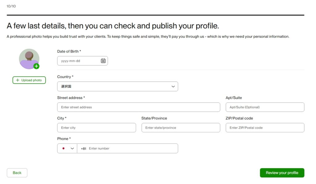 画像とともに順番に説明していくので、一つ一つ入力していきましょう。あとから変更できる箇所も多いので、あまり慎重にならず、気楽に入力していってOKです。が、理由がなければ名前は可能な限り本名で登録しましょう。Upworkも本名登録を推奨しています。
